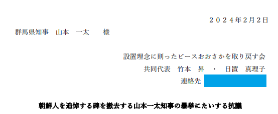 朝鮮人労働者の追悼碑を撤去した群馬県知事への抗議文です。この碑は、「群馬の森」(群馬県高崎市)に「記憶 反省 そして友好」の追悼碑を建てる会が2004年4月24日に建立しました。(画像をクリックしていただくと、内容が読めます)