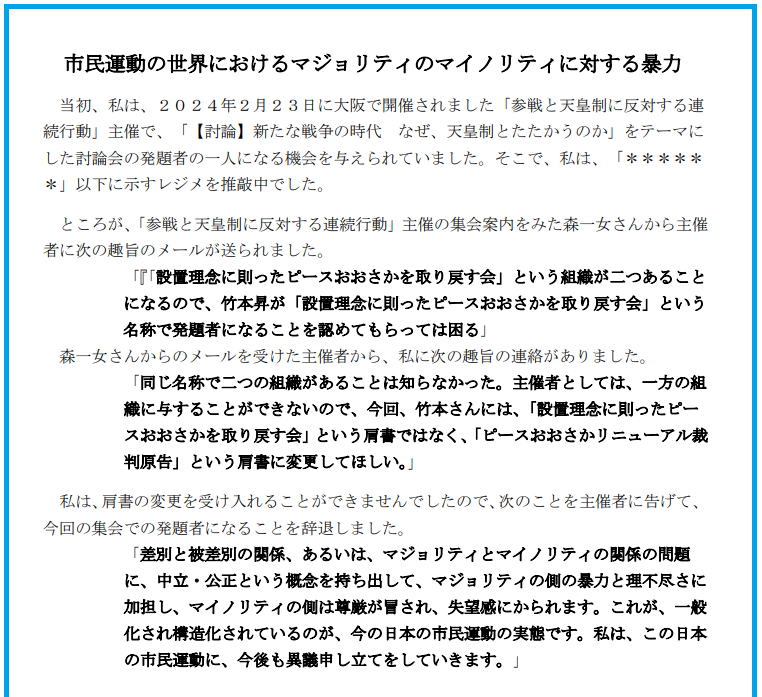 市民運動の世界におけるマジョリティのマイノリティに対する暴力/竹本 昇