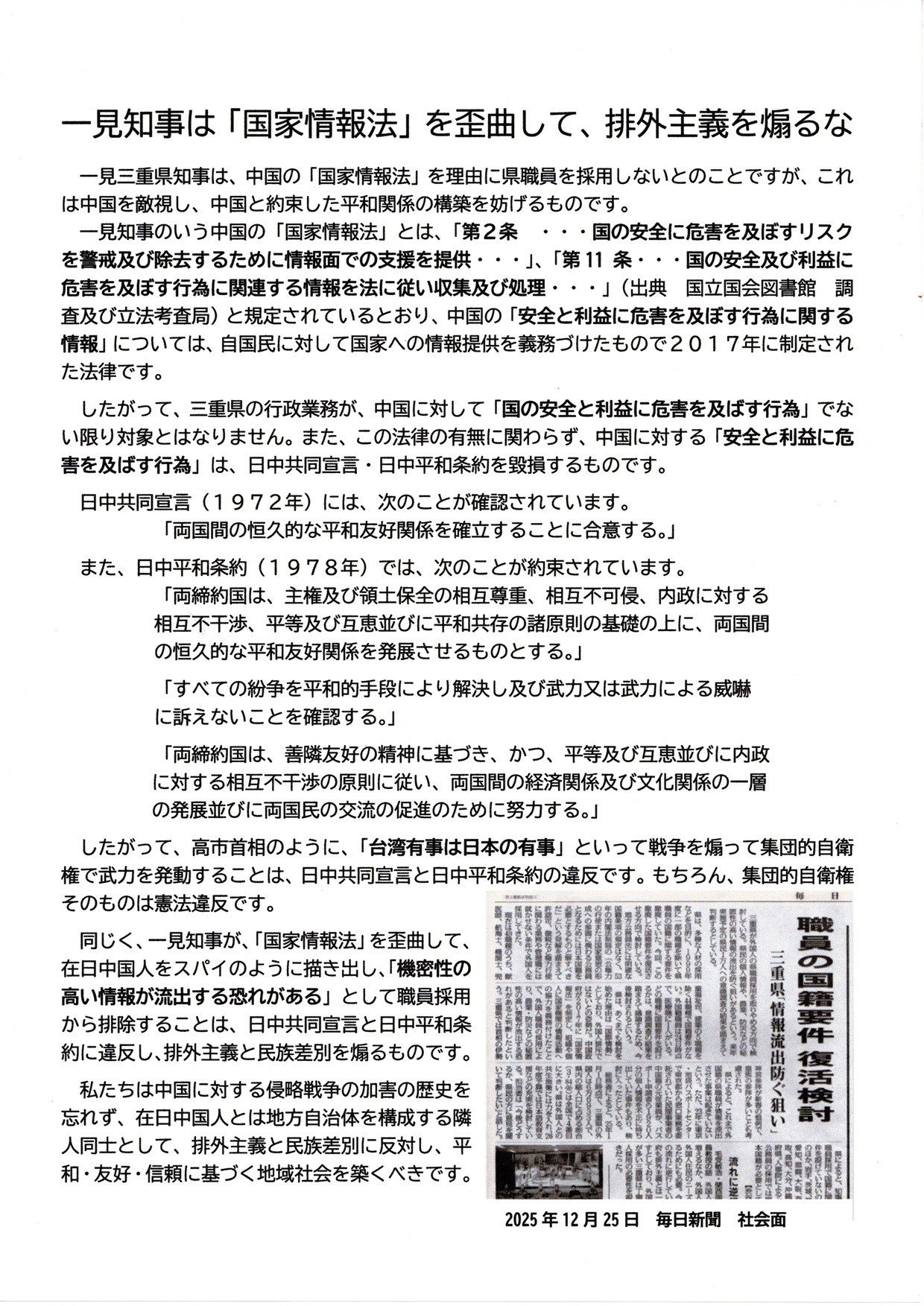 排外主義と民族差別をあおる一見三重県政を許すな!